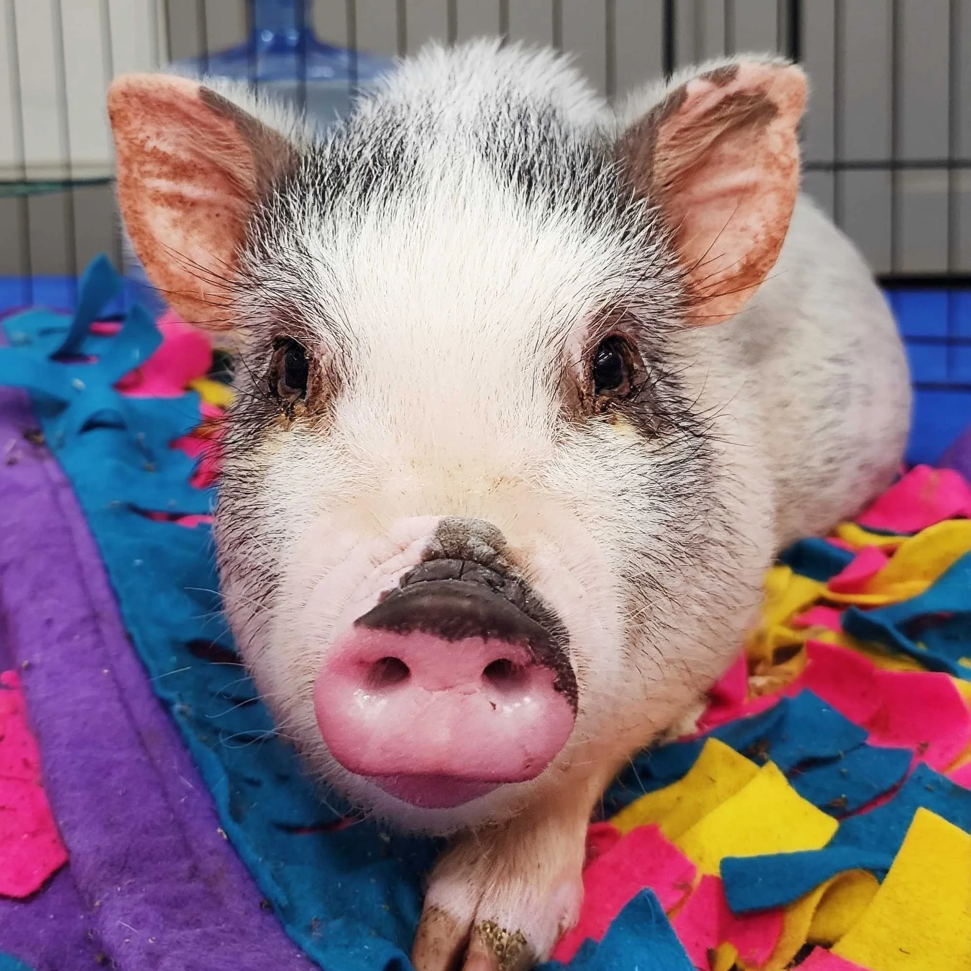 Red (above) and Puddles (right) are our lovable event mini pigs! They enjoy attending birthdays, educational programs, and special events, where they charm guests with their tricks and soak up plenty of belly rubs. Friendly and full of personality, they’re always a hit wherever they go!